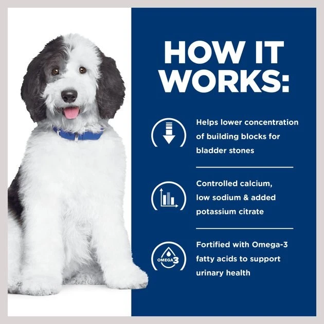 Help your canine companion maintain normal bladder health with Hill’s Prescription Diet c/d Multicare Urinary Care Chicken Flavor Dry Dog Food. Bladder stones are collections of mineral crystals that combine together in the urinary tract and create discomfort that can lead to more serious problems requiring the care of a veterinarian. Because the food your dog eats plays an important role in her overall health and well-being, Hill’s nutritionists and veterinarians have developed clinical nutrition especially formulated to help support her bladder and healthy urinary function. It’s formulated with a precise balance of minerals to deliver the essential nutrition she needs without overloading her system, which could encourage the formation of crystals.