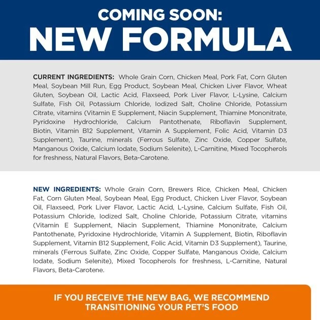 Whole Grain Corn, Brewers Rice, Chicken Meal, Chicken Fat, Corn Gluten Meal, Soybean Meal, Egg Product, Chicken Liver Flavor, Soybean Oil, Flaxseed, Pork Liver Flavor, Lactic Acid, L-Lysine, Calcium Sulfate, Fish Oil, Potassium Chloride, Iodized Salt, Choline Chloride, Potassium Citrate, vitamins (Vitamin E Supplement, Niacin Supplement, Thiamine Mononitrate, Calcium Pantothenate, Pyridoxine Hydrochloride, Vitamin A Supplement, Biotin, Riboflavin Supplement, Vitamin B12 Supplement, Folic Acid, Vitamin D3Supplement), Taurine, minerals (Ferrous Sulfate, Zinc Oxide, Copper Sulfate, Manganous Oxide, Calcium Iodate, Sodium Selenite), Mixed Tocopherols for freshness, L-Carnitine, Natural Flavors, Beta-Carotene.