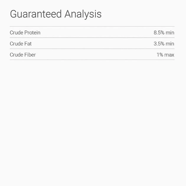 Pork By-Products, Water, Pork Liver, Chicken, Brewers Rice, Corn Starch, Soybean Meal, Chicken Liver Flavor, Chicken Fat, Fish Oil, Calcium Sulfate, Guar Gum, Brewers Dried Yeast, Dicalcium Phosphate, DL-Methionine, Calcium Carbonate, Choline Chloride, vitamins (Vitamin E Supplement, Thiamine Mononitrate, Pyridoxine Hydrochloride, Niacin Supplement, Calcium Pantothenate, Vitamin B12 Supplement, Riboflavin Supplement, Biotin, Folic Acid, Vitamin D3 Supplement), Taurine, Iodized Salt, Potassium Citrate, Potassium Chloride, L-Lysine, minerals (Zinc Oxide, Ferrous Sulfate, Manganous Oxide, Calcium Iodate), Beta-Carotene.