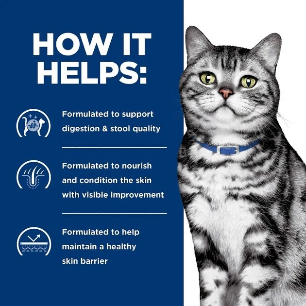 - Clinical nutrition especially formulated to support your cat’s skin and food sensitivities by soothing itchy and scratchy skin