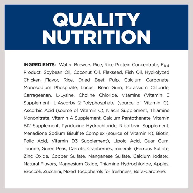 Water, Brewers Rice, Rice Protein Concentrate, Egg Product, Soybean Oil, Coconut Oil, Flaxseed, Fish Oil, Hydrolyzed Chicken Flavor, Rice, Dried Beet Pulp, Calcium Carbonate, Monosodium Phosphate, Locust Bean Gum, Potassium Chloride, Carrageenan, L-Lysine, Choline Chloride, vitamins (Vitamin E Supplement, L-Ascorbyl-2-Polyphosphate (source of Vitamin C), Ascorbic Acid (source of Vitamin C), Niacin Supplement, Thiamine Mononitrate, Vitamin A Supplement, Calcium Pantothenate, Vitamin B12 Supplement, Pyridoxine Hydrochloride, Riboflavin Supplement, Menadione Sodium Bisulfite Complex (source of Vitamin K), Biotin, Folic Acid, Vitamin D3 Supplement), Lipoic Acid, Guar Gum, Taurine, Green Peas, Carrots, Cranberries, minerals (Ferrous Sulfate, Zinc Oxide, Copper Sulfate, Manganese Sulfate, Calcium Iodate), Natural Flavors, Magnesium Oxide, Thiamine Hydrochloride, Apples, Broccoli, Zucchini, Mixed Tocopherols for freshness, Beta-Carotene.