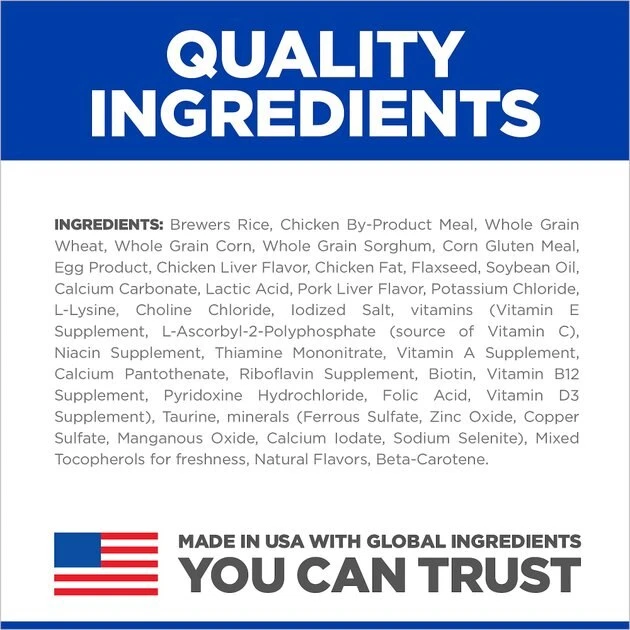 Chicken, Brewers Rice, Corn Gluten Meal, Chicken Fat, Wheat Gluten, Pea Protein, Whole Grain Corn, Chicken Meal, Whole Grain Oats, Ground Pecan Shells, Cracked Pearled Barley, Dried Beet Pulp, Chicken Liver Flavor, Flaxseed, Psyllium Seed Husk, Dried Citrus Pulp, Fish Oil, Lactic Acid, L-Lysine, DL-Methionine, Pumpkin, Pressed Cranberries, Fructooligosaccharides (FOS), Potassium Chloride, Choline Chloride, Taurine, Iodized Salt, vitamins (Vitamin E Supplement, L-Ascorbyl-2-Polyphosphate (source of Vitamin C), Niacin Supplement, Thiamine Mononitrate, Vitamin A Supplement, Calcium Pantothenate, Riboflavin Supplement, Biotin, Vitamin B12 Supplement, Pyridoxine Hydrochloride, Folic Acid, Vitamin D3 Supplement), Calcium Sulfate, minerals (Ferrous Sulfate, Zinc Oxide, Copper Sulfate, Manganous Oxide, Calcium Iodate, Sodium Selenite), Mixed Tocopherols for freshness, Natural Flavors, Beta-Carotene.