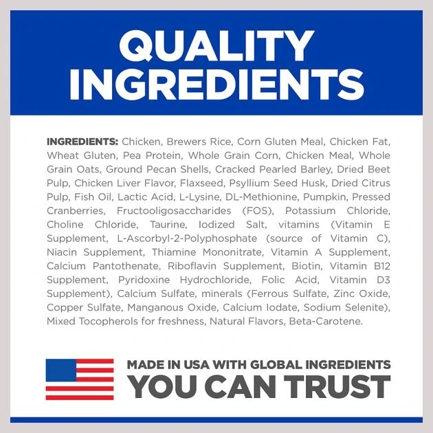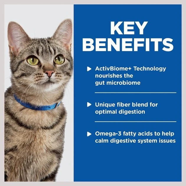 Hill’s Prescription Diet Gastrointestinal Biome Digestive/Fiber Care with Chicken Dry Cat Food is thoughtfully developed for GI care by Hill’s nutritionists and veterinarians. It’s contains a blend of prebiotics to promote healthy, regular stool and support your kitty’s digestive health. It also helps promote a urinary environment that’s difficult for struvite and calcium oxalate crystals to develop. This wet dry food is made in the USA with trusted global ingredients. Talk to your veterinarian to see if this Hill’s Prescription Diet recipe is right for your furry friend!