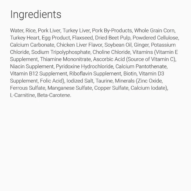 Water, Rice, Pork Liver, Turkey Giblets, Pork By-Products, Whole Grain Corn, Dried Beet Pulp, Egg Whites, Flaxseed, Ground Pecan Shells, Chicken Liver Flavor, Soybean Oil, Dicalcium Phosphate, Calcium Carbonate, Potassium Chloride, Ginger, Iodized Salt, Dried Citrus Pulp, vitamins (Vitamin E Supplement, L-Ascorbyl-2-Polyphosphate (source of Vitamin C), Thiamine Mononitrate, Niacin Supplement, Pyridoxine Hydrochloride, Calcium Pantothenate, Vitamin B12 Supplement, Menadione Sodium Bisulfite Complex (source of Vitamin K), Riboflavin Supplement, Biotin, Vitamin D3 Supplement, Folic Acid), Pressed Cranberries, Choline Chloride, L-Carnitine, Magnesium Oxide, Taurine, minerals (Zinc Oxide, Ferrous Sulfate, Manganese Sulfate, Copper Sulfate, Calcium Iodate), Beta-Carotene.