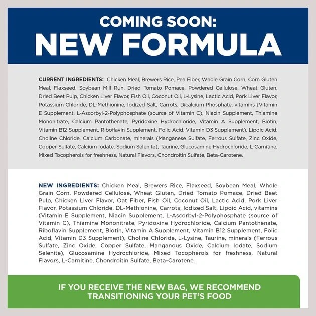 Chicken Meal, Brewers Rice, Flaxseed, Soybean Meal, Whole Grain Corn, Powdered Cellulose, Wheat Gluten, Dried Tomato Pomace, Dried Beet Pulp, Chicken Liver Flavor, Oat Fiber, Fish Oil, Coconut Oil, Lactic Acid, Pork Liver Flavor, Potassium Chloride, DL-Methionine, Carrots, Iodized Salt, Lipoic Acid, vitamins (Vitamin E Supplement, Niacin Supplement, L-Ascorbyl-2-Polyphosphate (source of Vitamin C), Thiamine Mononitrate, Pyridoxine Hydrochloride, Calcium Pantothenate, Riboflavin Supplement, Biotin, Vitamin A Supplement, Vitamin B12 Supplement, Folic Acid, Vitamin D3 Supplement), Choline Chloride, L-Lysine, Taurine, minerals (Ferrous Sulfate, Zinc Oxide, Copper Sulfate, Manganous Oxide, Calcium Iodate, Sodium Selenite), Glucosamine Hydrochloride, Mixed Tocopherols for freshness, Natural Flavors, L-Carnitine, Chondroitin Sulfate, Beta-Carotene.
