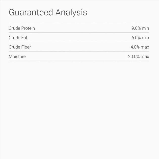 Chicken, Potatoes, Wheat Flour, Cane Molasses, Glycerin, Yellow Peas, Dried Beet Pulp, Chicken Fat, Gelatin, Fish Oil, Lactic Acid, Natural Flavor, Flaxseed, Chicken Liver Flavor, Mixed Tocopherols for freshness, Citric Acid for Freshness, L-Carnitine, Rosemary Extract.