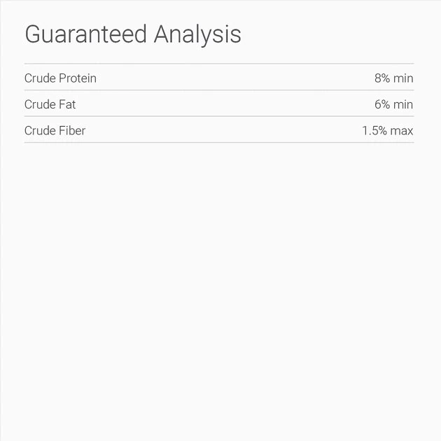 Water, Pork Liver, Pork By-Products, Chicken, Corn Flour, Rice, Chicken Fat, Chicken Liver Flavor, Powdered Cellulose, Calcium Carbonate, Fish Oil, Natural Flavor, L-Lysine, Potassium Chloride, DL-Methionine, vitamins (Vitamin E Supplement, Thiamine Mononitrate, Ascorbic Acid (source of Vitamin C), Niacin Supplement, Pyridoxine Hydrochloride, Calcium Pantothenate, Vitamin B12 Supplement, Riboflavin Supplement, Folic Acid, Vitamin D3 Supplement, Biotin), Guar Gum, Taurine, Choline Chloride, Salt, Cysteine, Dicalcium Phosphate, L-Carnitine, minerals (Ferrous Sulfate, Zinc Oxide, Copper Sulfate, Manganese Sulfate), Beta-Carotene.