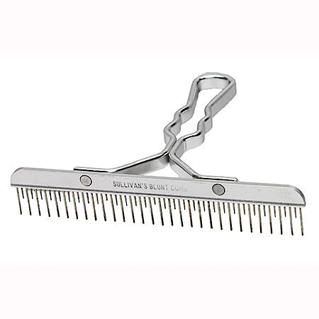 The Sullivan Supply Aluminum Handle Blunt Tooth Fluffer Farm Animal Comb balances strength with just a little bend for an ideal grooming tool. It’s ideal for use on thick-haired cattle, since its short teeth pop out long guard hairs and prevent the lines that you might see using a skiptooth comb. The larger-diameter teeth have rounded tips for gentle combing. This comb isn’t brittle to cause breakage, and each tooth is individually placed by hand. Instead of using glue, which can dissolve when exposed to water and adhesive removers, the comb blades are crimp pressed to create a secure hold. This makes for a top-quality, durable comb that will become a must-have in your grooming kit.
